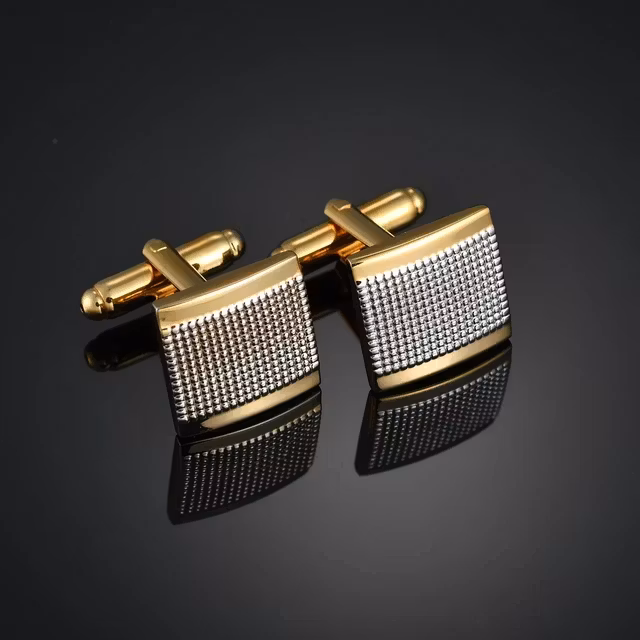 Manschettknappar som både är guld och silverfärgade samt har ett strukturmönster på framsidan. Knapparna mäter ca 1,5 x 1,5 cm