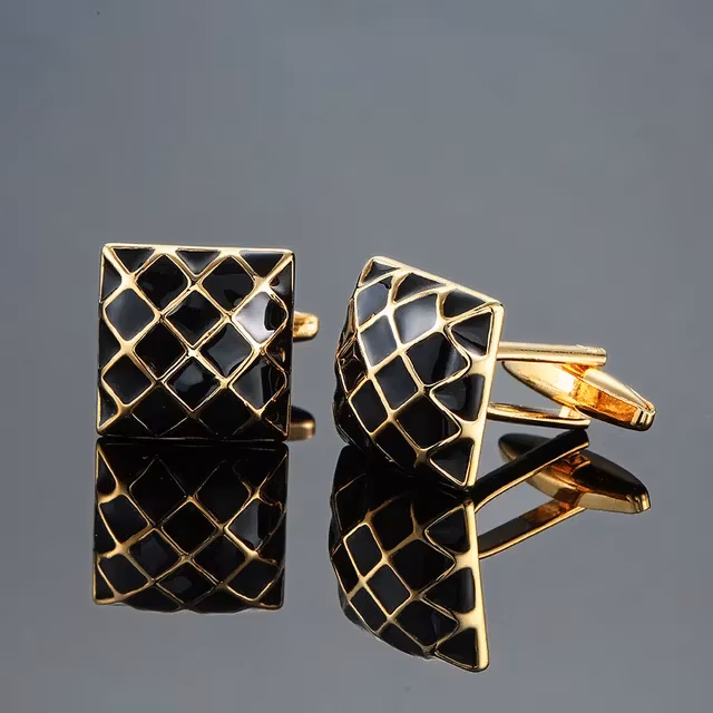Kvadratiska, välvda manschettknappar smyckat med ett guldfärgat rutmönster på svart bakgrund. Knapparna mäter ca 1,75 x 1,75 cm.
