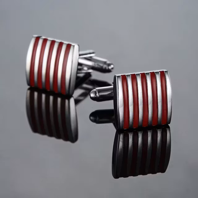 Rektangulära, silverfärgade manschettknappar smyckade med röda linjer. Knapparna mäter 1,6 x 1,4 cm.