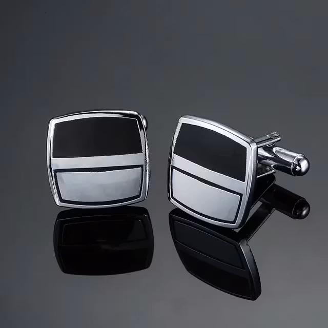 Fyrkantiga manschettknappar med mönster i svart och silver. Knapparna mäter ca 1,6 x 1,6 cm.