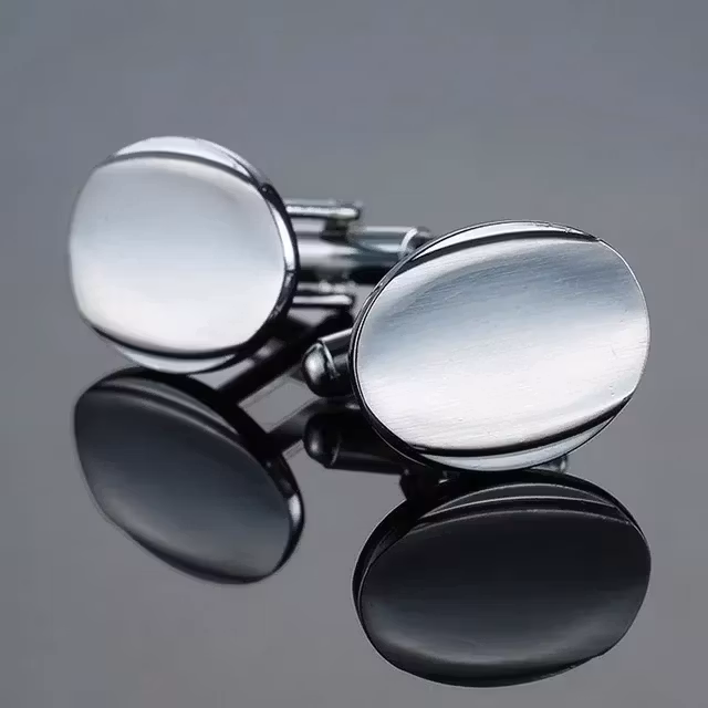 Silverfärgade manschettknappar som är ovala till formen. Ovalerna mäter ca 1,8 x 1,6 cm