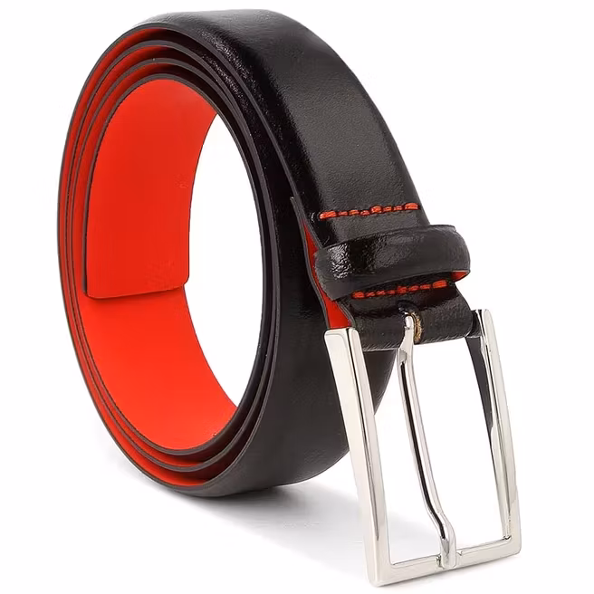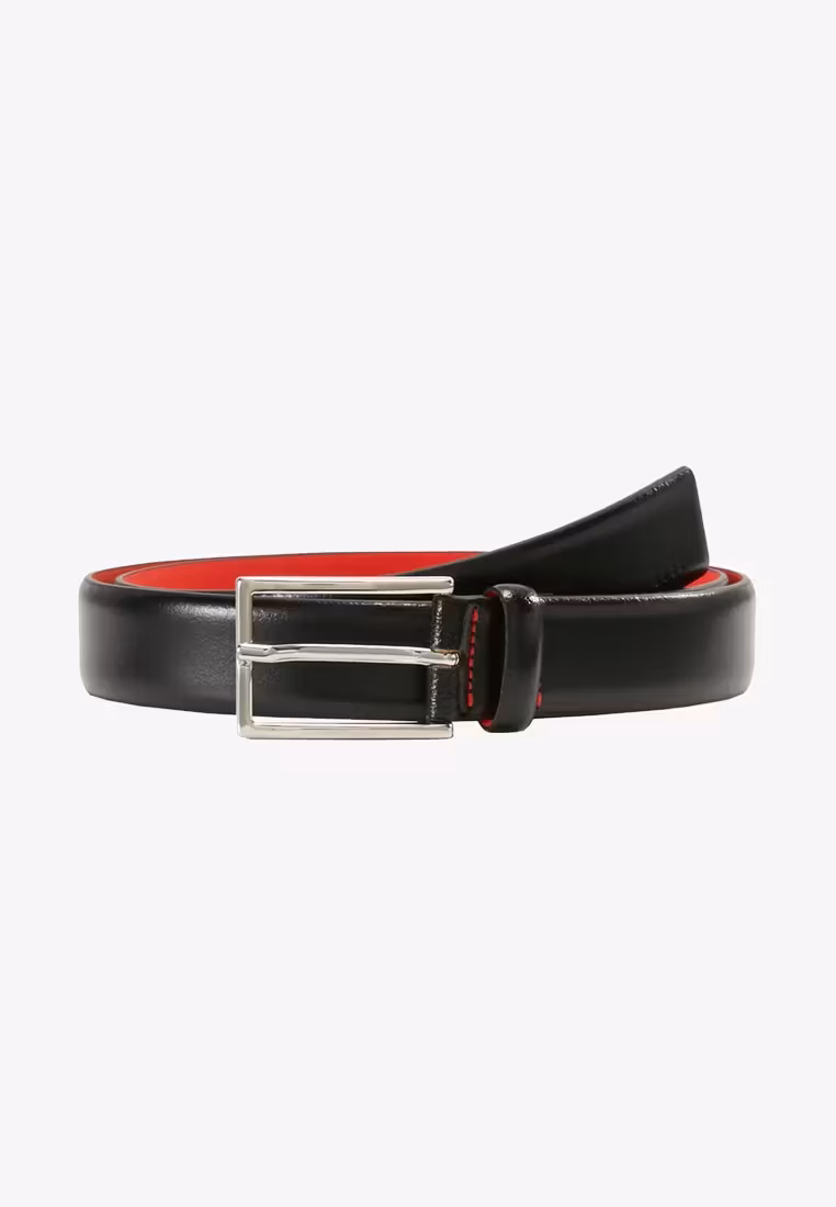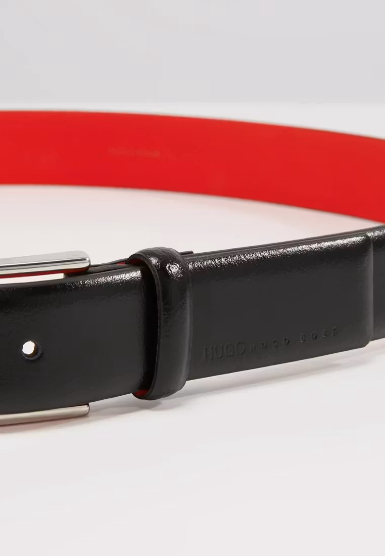 Skärp i läder från Hugo Boss, röd baksida för bästa effekt. Skärpet är ca 3 cm brett och mäter 110 cm på längden.