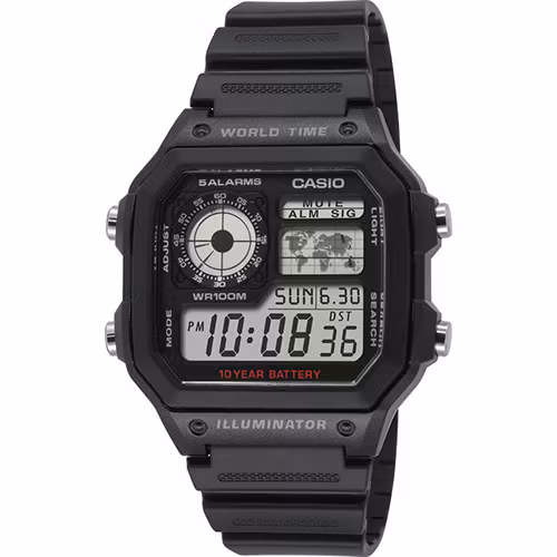 Ett klassiskt digitalur från Casio, denna variant bl.a med visning av 4st tidszoner, funktion för världstid, 5 dagliga alarm samt mycket mer.