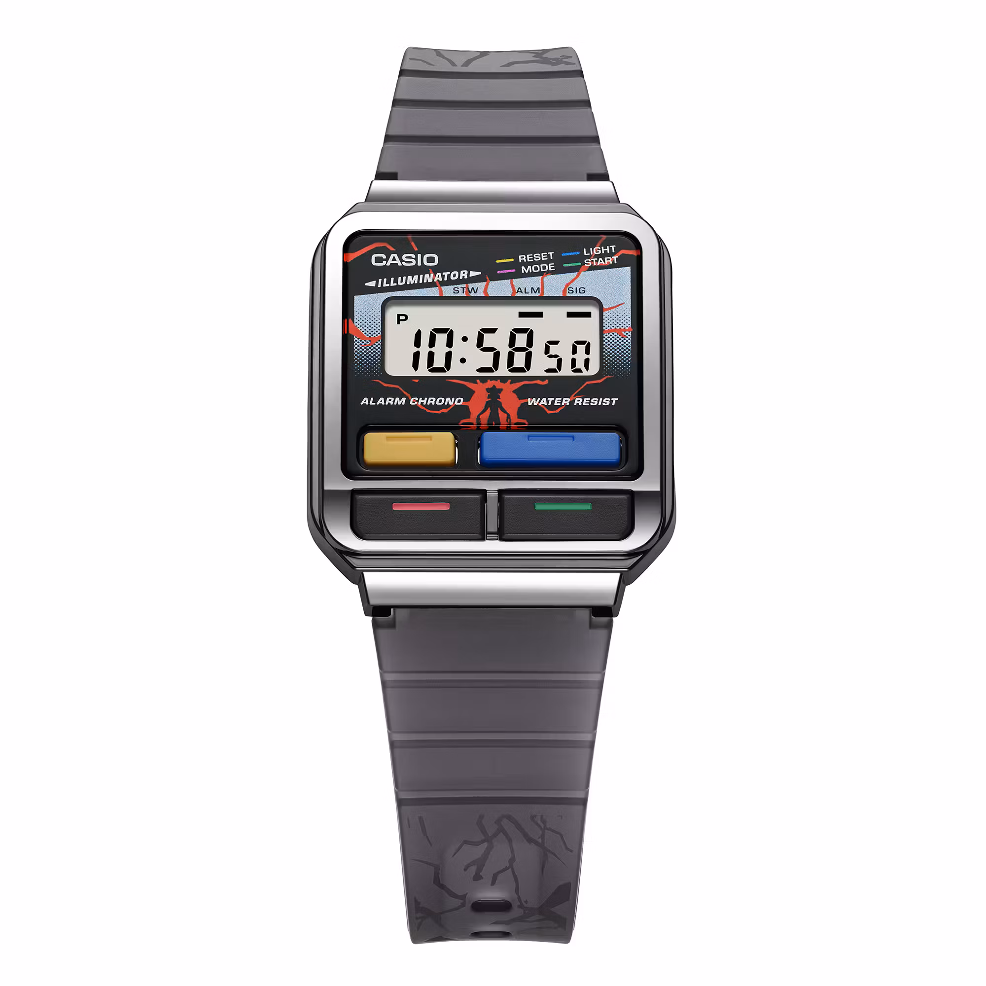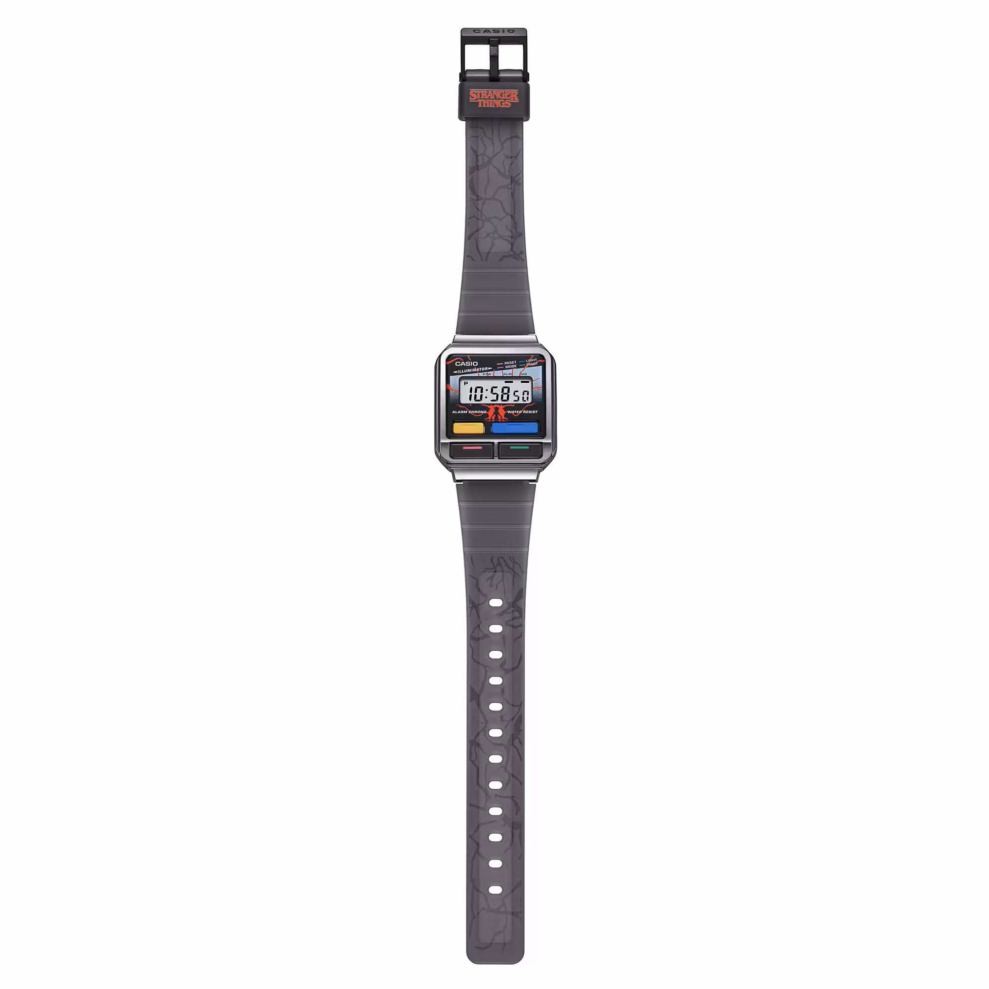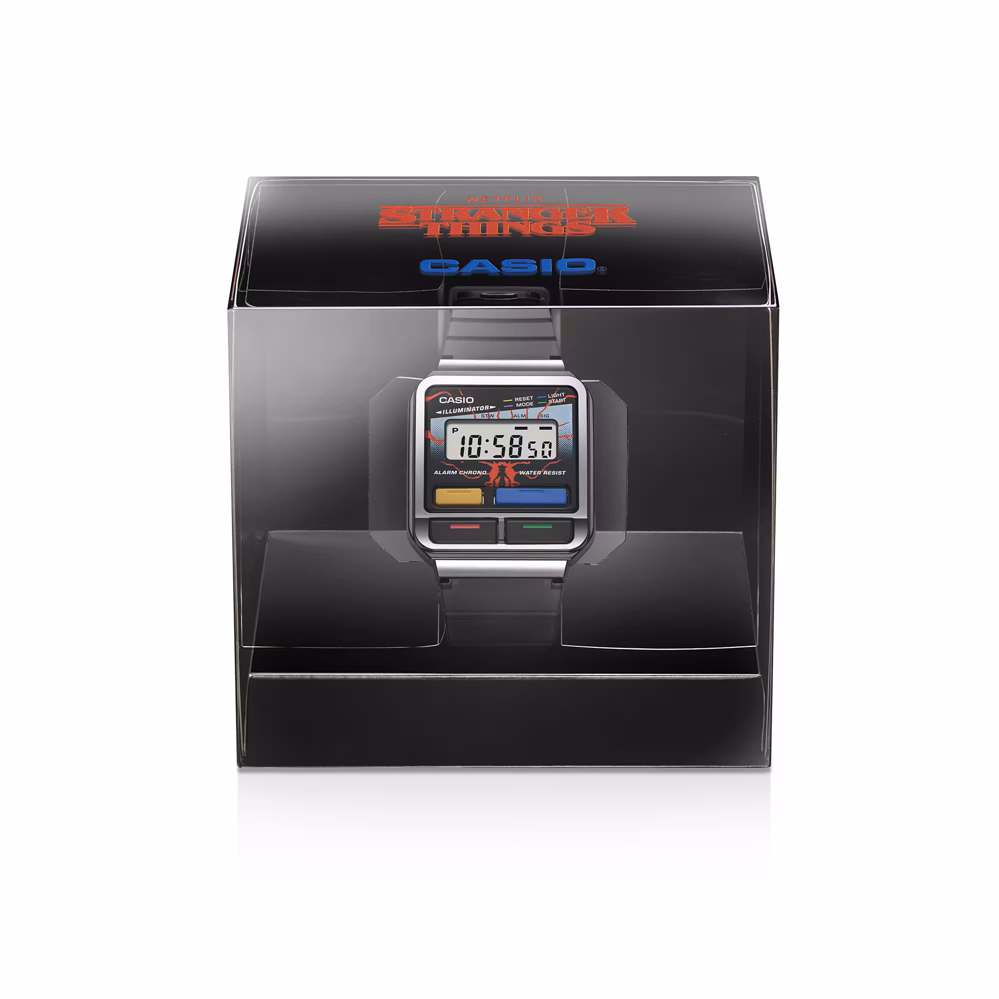 Kliv in i en alternativ dimension med ett exklusivt samarbete mellan Casio och TV-serien Stranger Things. I denna design skildrar urtavlan världen från Stranger Things bl.a med sina färgglada knappar inspirerade från 1980-talet och vid ett tryck på LED-ljusknappen återskapas den blinkande ljuseffekten som visas i TV-serien när demogorgonen dyker upp.