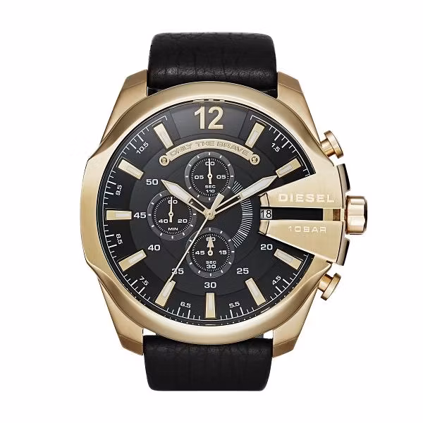 En stor klocka från Diesel med en diameter på 51 mm. Guldfärgad och med ett armband i äkta läder. Levereras i en presentlåda från Diesel.