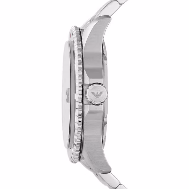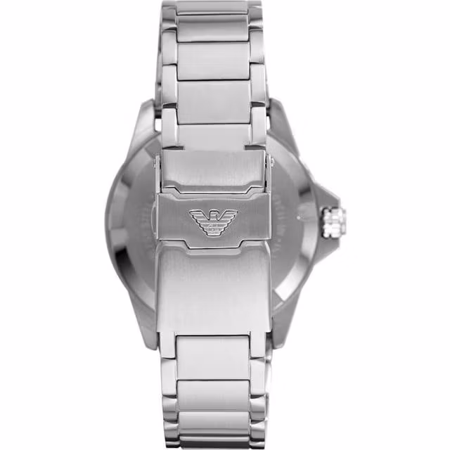 Klocka från Emporio Armani med en urtavla i en blå metallicfärg och flerfärgad bezel i rött och blått. Levereras i en presentlåda från Emporio Armani.