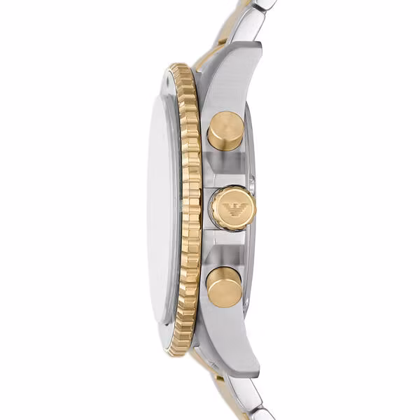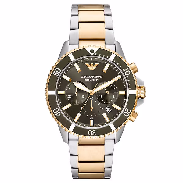Klocka från Emporio Armani med ett armband som går i både färgerna guld och silver. Urtavla och bezel går i en skimrande väldigt mörkt grön färg, nästan på gränsen till svart. Klockan har både kronograf-funktioner samt datumvisning. Levereras i en presentlåda från Emporio Armani.