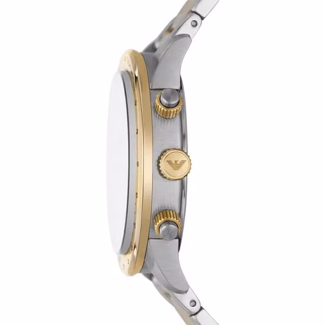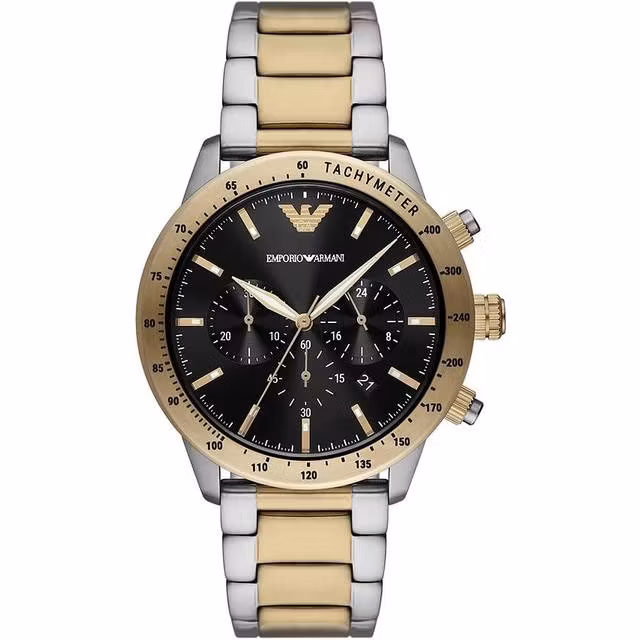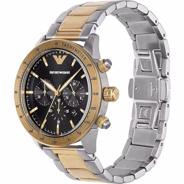 Klocka från Emporio Armani med ett armband som går i både färgerna guld och silver. Guldfärgad bezel och en urtavla i svart med guldfärgade detaljer. Klockan har både kronograf-funktioner, takometer samt datumvisning. Levereras i en presentlåda från Emporio Armani.