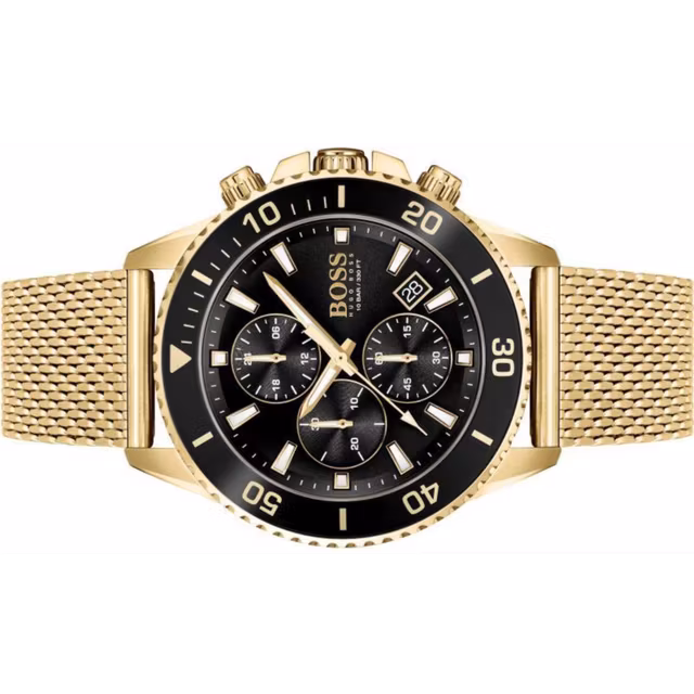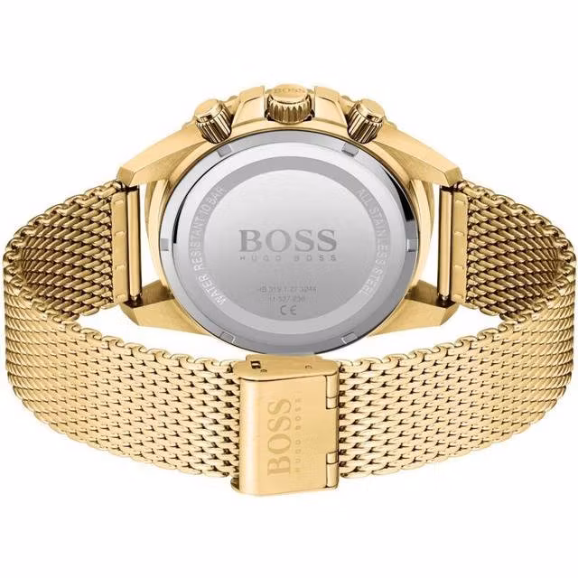 Armbandsur i rostfritt stål från Hugo Boss. Denna modell med en boett på ca 46 mm och kommer med ett mesharmband. Klockan är också utrustad med kronograf och datumvisning. Levereras självklart i en presentlåda från Hugo Boss.