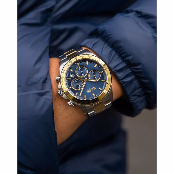 Elegant herrklocka från Hugo Boss med stålarmband och blå urtavla. Klockan har kronograffunktion och levereras i presentförpackning från Hugo Boss.