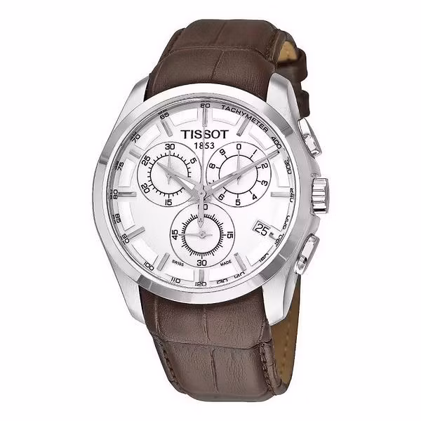 Klocka från Tissot med brunt läderarmband. Klockan har också både kronograf, takometer och datumvisning. Levereras med en presentlåda från Tissot samt 2 års garanti.