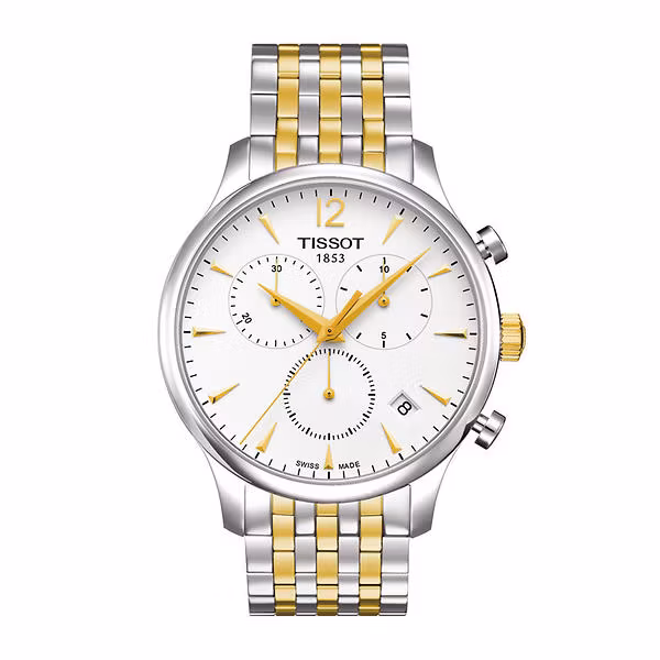 Klocka i klassiskt utförande från Tissot. Ett elegant ur som går i både guld och silver samt är utrustad med både datumvisning och kronograf. Levereras självklart med en presentlåda från Tissot samt 2 års garanti.