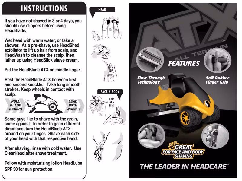 HeadBlade ATX "All Terrain Razor" Le-Black är en ny pimpad design av ATX-hyveln. Den är enkel och effektiv att använda, även för dig som är van med en konventionell rakhyvel. Denna hyvel ska dras med hjulen framåt, till skillnad mot tidigare HeadBlade-hyvlar som puttas med bladet framåt. Den nya designen gör det lättare att raka "på känsla". De nya multibladen har Flow Through-design vilket gör det lättare att rengöra bladen. Nytt förbättrat grepp på hyveln. Den går även att använda i ansiktet och på kroppen. Hyveln levereras med HB4-bladet, och är även kompatibel med HB6-bladet.
