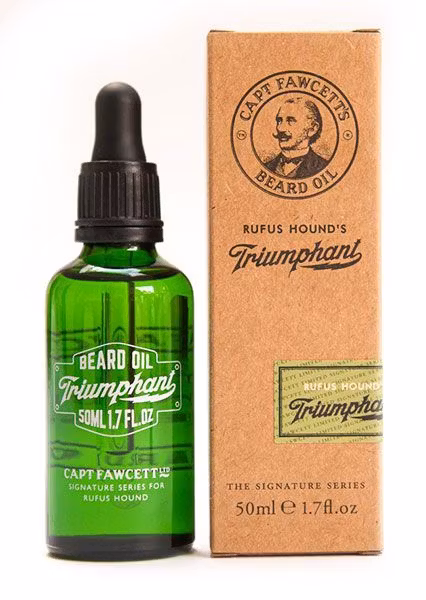 Captain Fawcett Beard Oil Triumphant skäggolja är ett doftsamarbete med den engelske skådespelaren och komikern Rufus Hound. En doft som påminner om en vårdag - som Rufus upplever den - körandes på sin älskade motorcykel genom Englands blomstrande, gröna landsbyggd. Den är baserad på fyra närande oljor: mandelolja, jojobaolja, solrosfröolja och Vitamin E. Den har en vårdande och mjukgörande effekt på både skägg och skäggbotten.